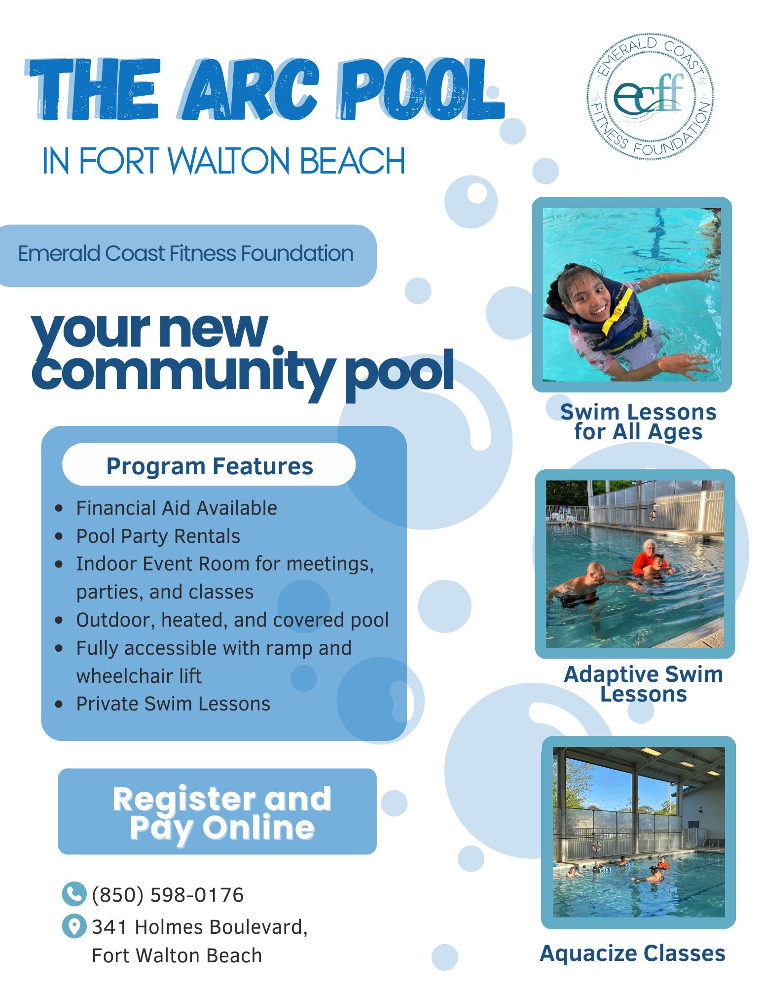 Please visit “The Arc Pool” on Facebook for more information and scheduling, or contact Wendy Rudman via email: wendyvrudman@gmail.com or by phone: +1 850-598-0176